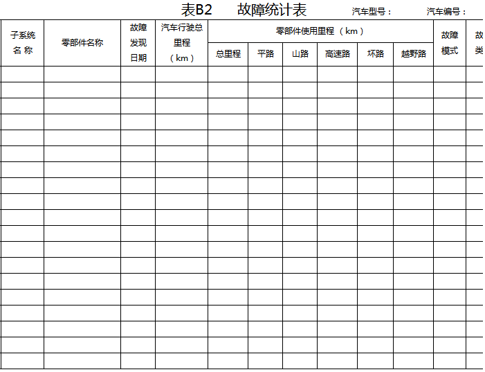 9.2 可靠性行駛試驗期間,對所有故障做詳細記錄,包括故障里程、模式、排除措施及故障停車時間、排除故障工時。