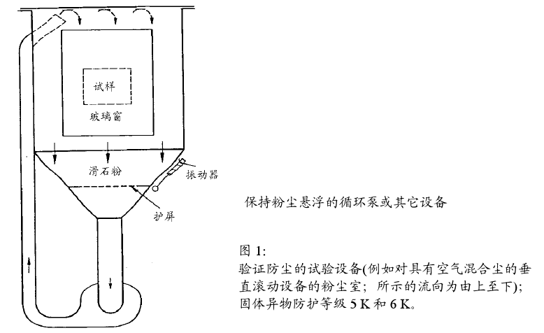 對具有空氣混合塵垂直流向的5K和6K級固體防護(防塵或塵密)驗證用的試驗裝置。也可根據(jù)DINV 40046-48,商定采用水平流向的粉塵室(如圖2)。